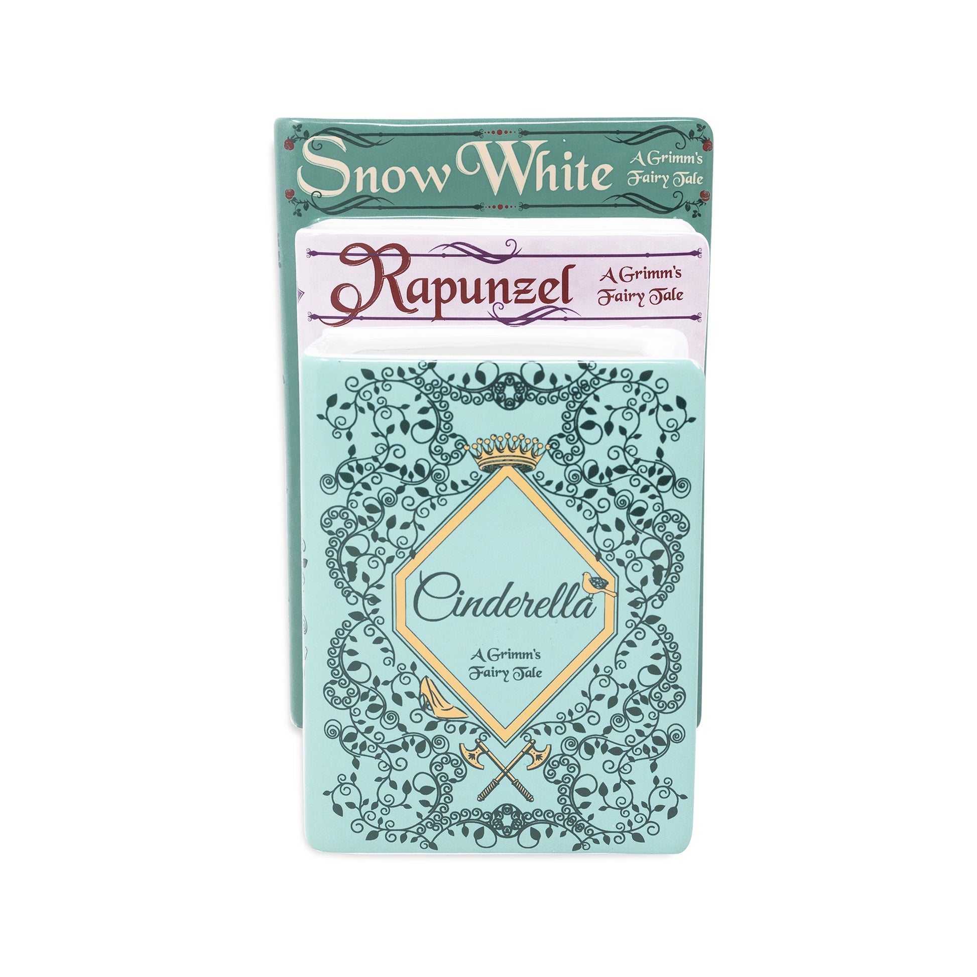 However you stack it, this triple book vase featuring iconic Grimm's Fairy Tale titles is a must-have for any book lover's collection. Designed to resemble three staggered hardcover books in a row, this ceramic vase includes timeless titles like Snow White, Rapunzel, and Cinderella. The vase has a spacious interior divided into three sections, allowing you to organize kitchenware and office supplies or create a beautiful floral arrangement.