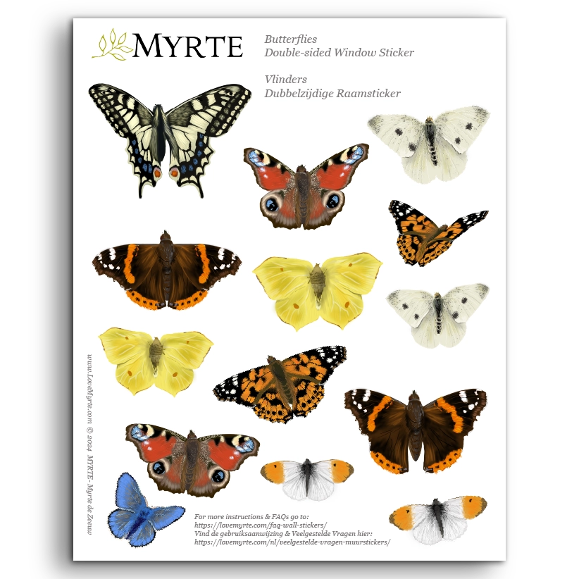 A 21.2 x 26.7 cm sheet with 14 stickers. Two stickers: the Peacock Butterfly, Painted Lady Butterfly, Brimstone Butterfly, Red Admiral Butterfly, Orangetip Butterfly, and Large White Butterfly. One sticker: the Common Blue Butterfly and the Swallowtail Butterfly (without antennae).