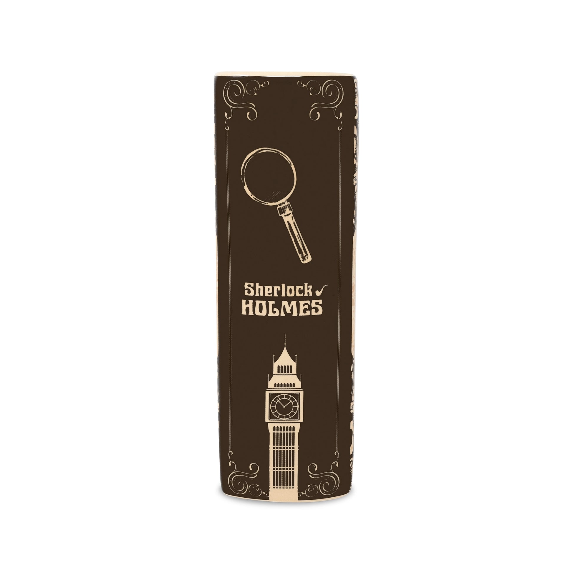 Our large ceramic book vase is the perfect addition to any book lover's space. Designed to mimic a hardcover book, the vase features sculpted pages with a wide top opening for flowers, office supplies, kitchen utensils, and more. The cover features art inspired by Sir Arthur Conan Doyle's beloved story, Sherlock Holmes, to enhance your space with literary charm.